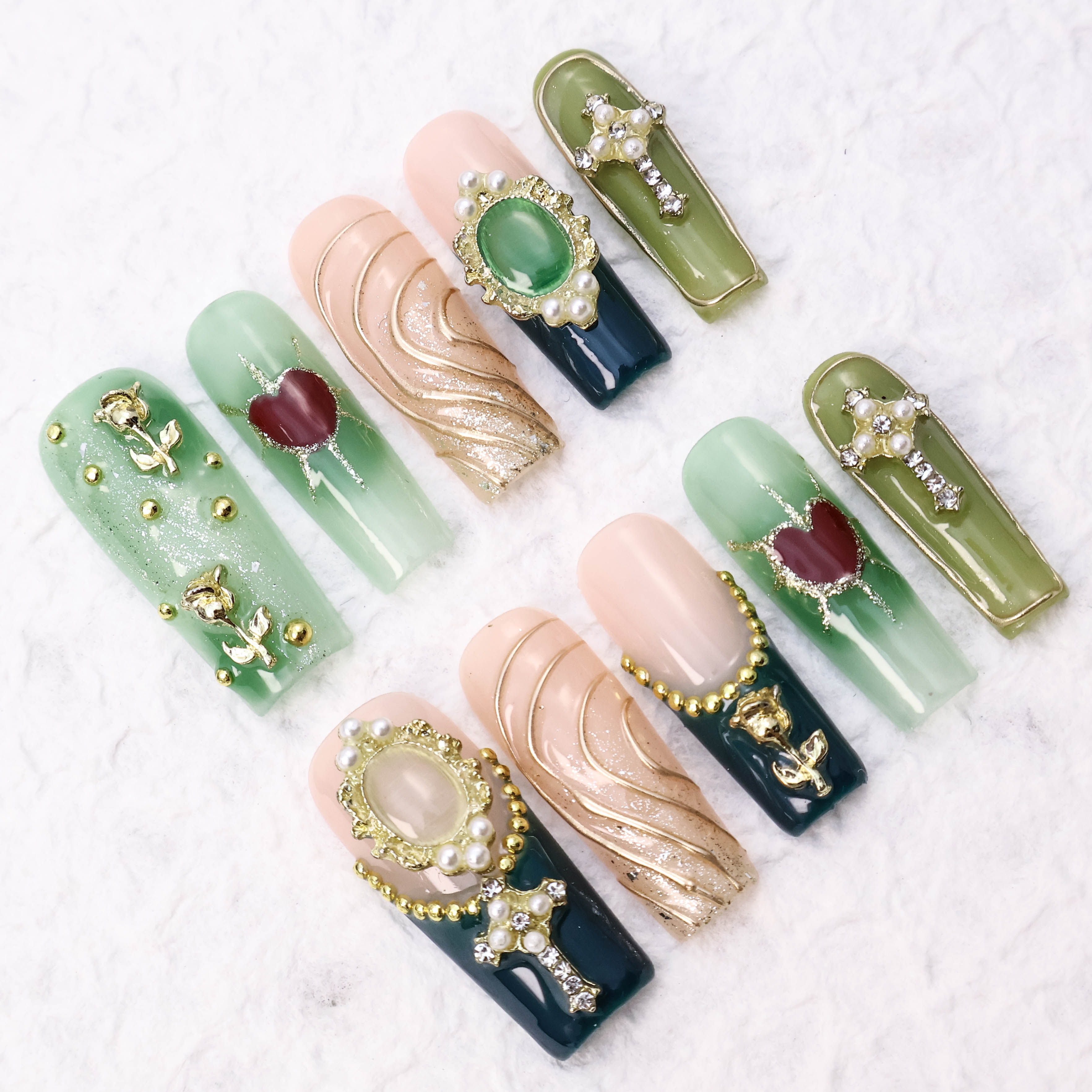 Treat yourself to a high-end manicure with these rewearable, elegant,prestigious, jeweled press-on nails. 100% hand made guarantee! MIXX exclusive manicurists with 5+years work experiences makes every piece nail unique and superior. These salon quality sculpted nails are reusable up to 10 times , and last for a week.